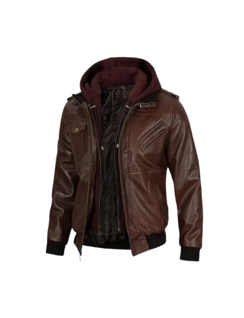 Dark Brown Hooded Leather Jacket For Men