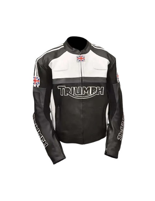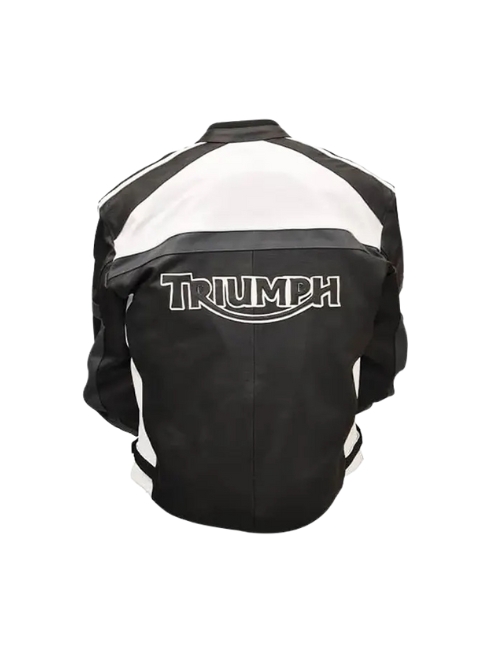 The jacket looks sleek in black and white the Triumph logo adds a bold edge.